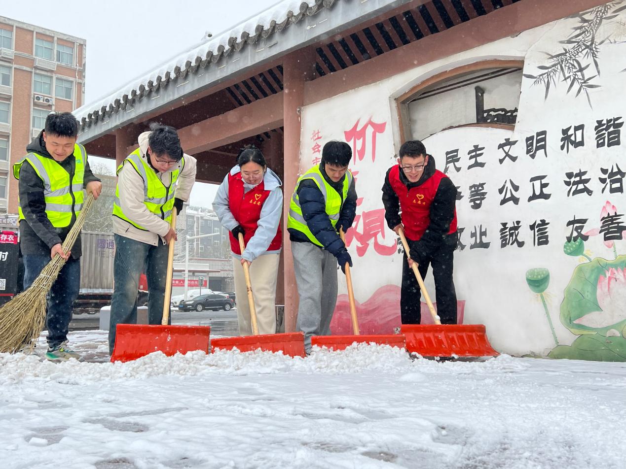 党员先锋队带头奔赴济南遥墙街道,携带铁锹、扫帚等工具快速投入清雪工作。重点清扫人行道、街角广场等群众活动密集区域,以实际行动践行社会责任,传递冬日温暖。皑皑白雪中,志愿者的红色马甲与中建七局的绿色马甲交相辉映,跃动成寒风中温暖的风景。路过的居民纷纷驻足称赞,遥墙街道工作人员也对项目团队的及时支援表示感谢。