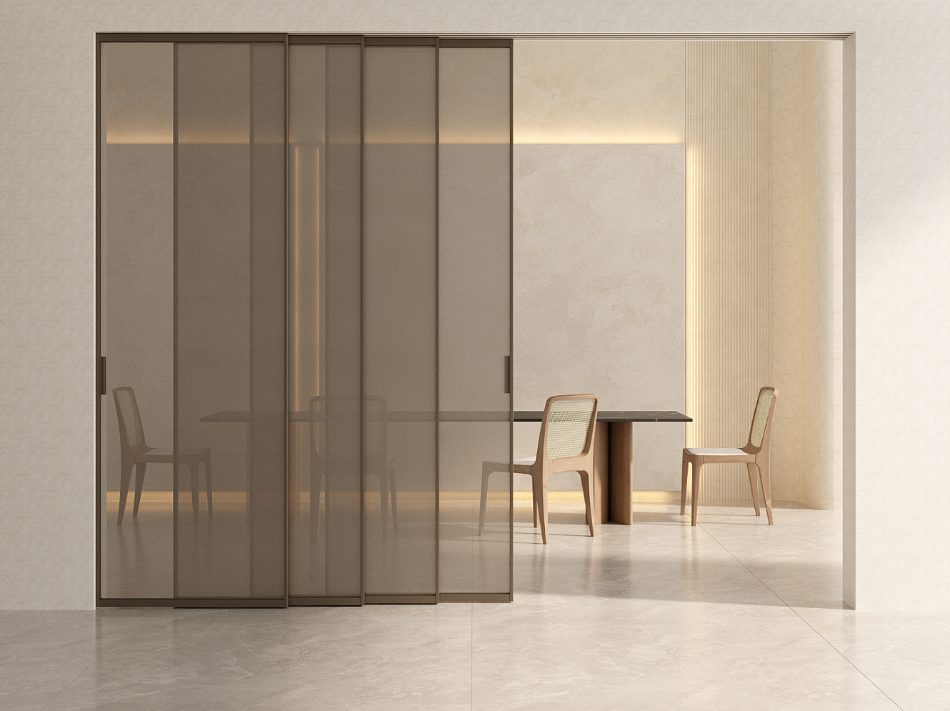 传统隔断门厚重的边框的设计,往往会割裂空间、阻挡光线,让家居显得局促压抑。ZMKM 全景门颠覆这一痛点,采用超窄金属细边设计,最大化释放玻璃可视面积,以 “少即是多” 的美学理念,让空间豁然开朗。