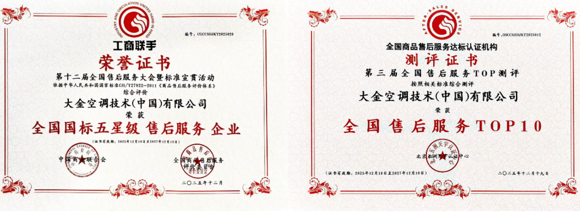 其中,大金再度凭借独树一帜的“智能预判+主动关怀式的全周期服务”,成为空调暖通领域的标杆,揽获“全国国标五星级售后服务企业”、“全国售后服务TOP10”两项代表当前国家评价体系下最高服务水平的权威荣誉,彰显了大金在服务端的领先实力。