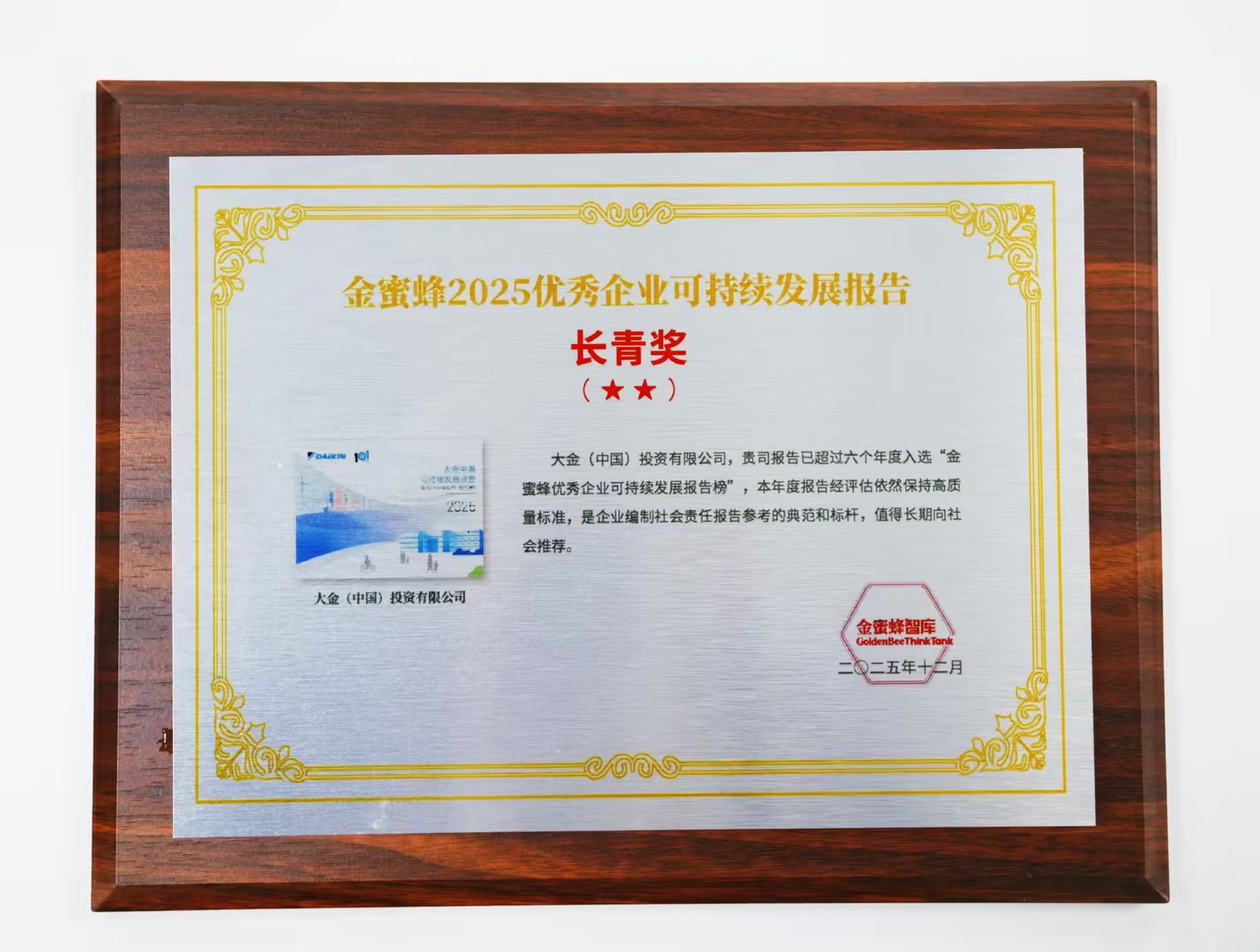 大金中国荣获金蜜蜂2025优秀企业可持续发展报告・长青奖二星级
