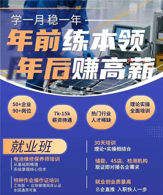 当新能源赛道的船票越来越紧俏,这场30天的电池维保+低压电工双证就业班,相当于给想入行的人递上了快速登船卡。年前花30天在深圳完成集训,年后就能拿着双证对接名企岗位,在这个人才紧缺的黄金行业里,实现结业即上岗,月薪过万的职业跃升。还在等什么呢?