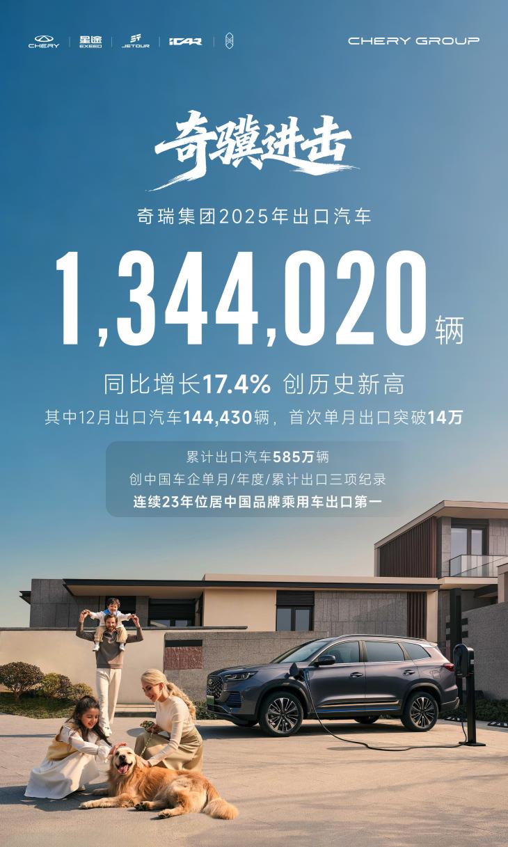 出口领域,奇瑞创下三项中国车企纪录:12月单月出口144430 辆,同比增长46.8%,首次突破14万辆;全年出口1344020辆,同比增长17.4%;累计出口达585万辆,平均每23秒就有一辆奇瑞汽车扬帆海外。凭借强劲表现,奇瑞连续23年位居中国品牌乘用车出口第一,成功进入英国、西班牙等15个欧洲市场,成为中国汽车出海标杆。