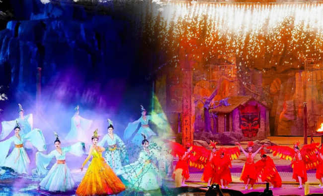 大型水舞光影体验剧《水秀》/大型火舞光影体验剧《火秀》:借取自然景观,真山真水真火焰,设有3000个座位;场景开阔,气势磅礴。