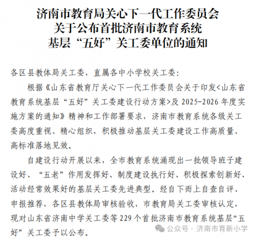 热烈祝贺济南市育新小学获评首批济南市教育系统基层“五好”关工委单位荣誉称号!