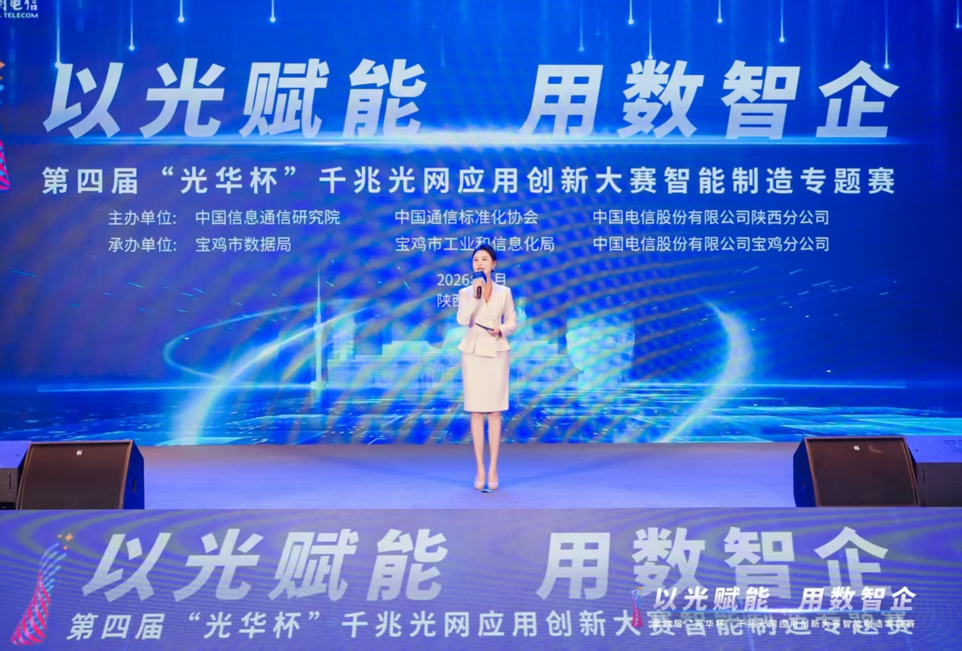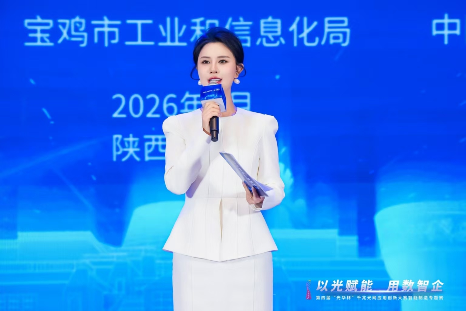 1月19日至20日,第四届“光华杯”千兆光网应用创新大赛智能制造专题决赛在历史文化名城宝鸡成功举办。本次大赛以“以光赋能 用数智企”为主题,汇聚全国50支优秀参赛团队同台竞技,历经启动仪式、路演比拼、颁奖盛典等多个环节,最终圆满落下帷幕。主持人周娜全程把控节奏、从容得体,以专业表现赢得全场嘉宾、参赛选手及观众的一致认可与高度赞誉。