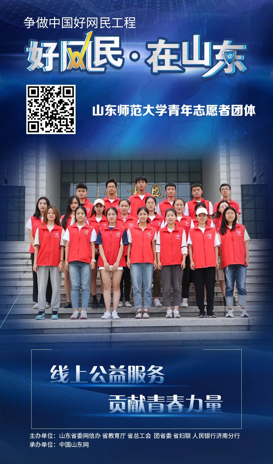 为深入推进实施“争做中国好网民工程”,大力培育具备爱国主义精神、网络法治观念、文明用网习惯、网络安全技能、责任担当意识等基本素养的新时代中国好网民。山东省委网信办、省教育厅、省总工会、团省委、省妇联、人民银行济南分行联合开展了“好网民•在山东”主题活动,在全省范围深入挖掘“校园好网民”“职工好网民”“青年好网民”“巾帼好网民”“金融好网民”以及“正能量社团”典型故事,大力传播好网民理念, 弘扬壮大网上正能量。9月15日起,陆续推出“好网民•在山东”优秀故事展播,把好网民和正能量社团的好故事分享给大家,让网络正能量温暖你我、滋养社会。