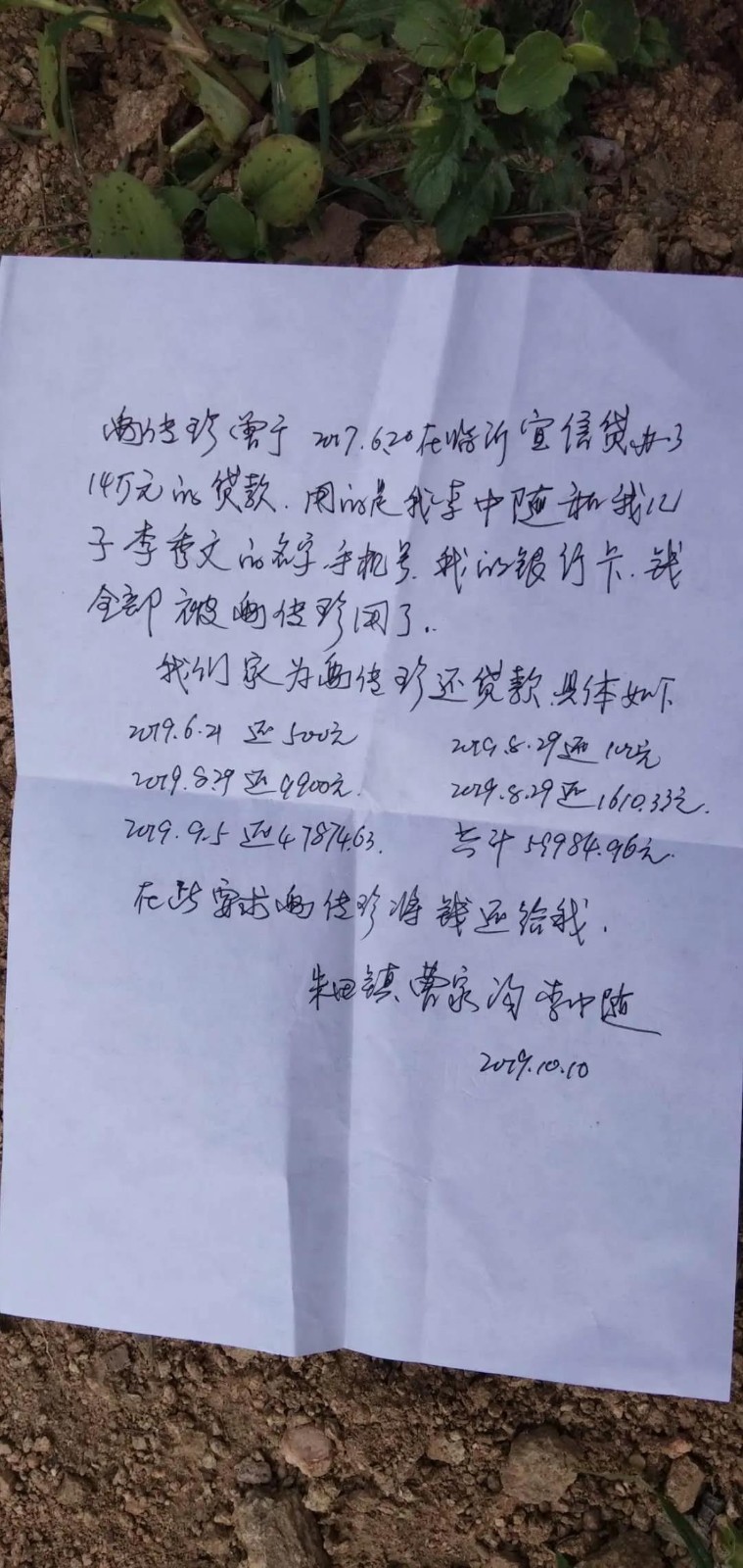 李中随还曾去禹传珍的村子找过她,但无功而返:“我找到他们村的村支书,村支书也借了她5万,到如今也联系不上。”村里人说她在一直在县城居住,但不了解具体地址。