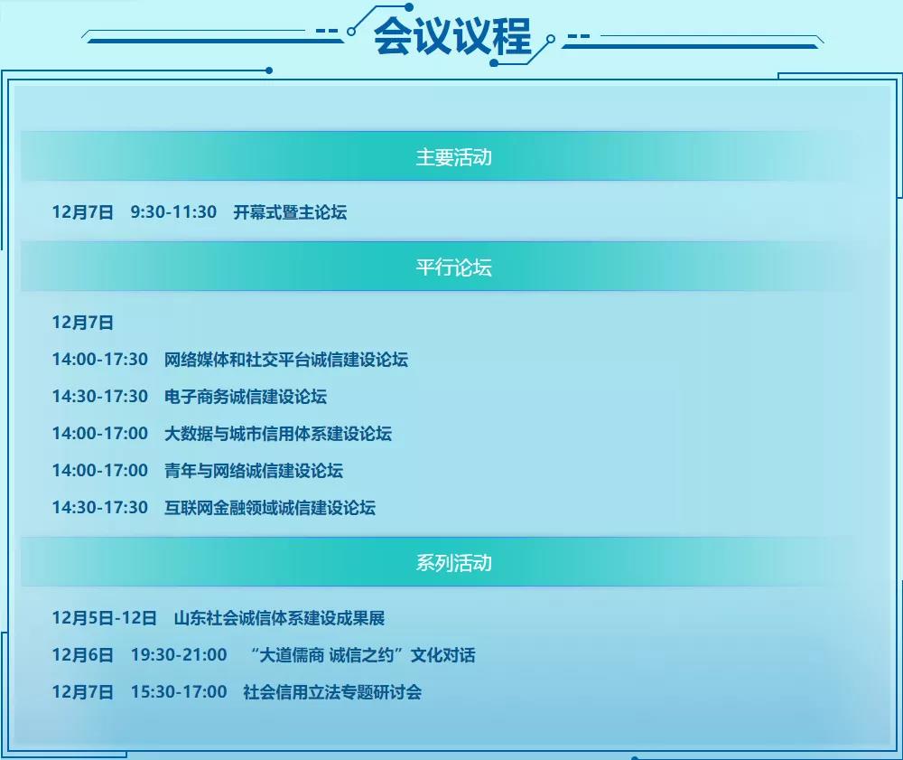 包括网络媒体和社交平台诚信建设论坛、电子商务诚信建设论坛、大数据与城市信用体系建设论坛、青年与网络诚信建设论坛、互联网金融领域诚信建设论坛。平行论坛拟安排领导致辞、主题演讲、圆桌对话活动。