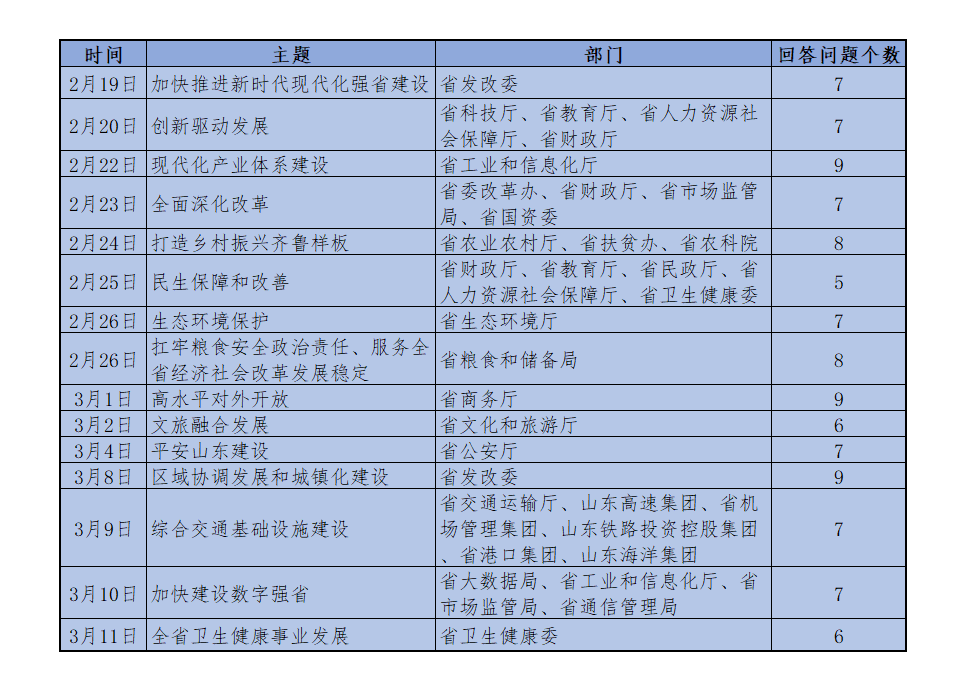 从2月19日到3月11日,21天时间里15场新闻发布会密集召开,这在全国各省市新闻发布工作中不多见。发布会紧紧围绕“十四五”规划纲要,精选了15个主题,分别是:加快推进新时代现代化强省建设、创新驱动发展、现代化产业体系建设、全面深化改革、打造乡村振兴齐鲁样板、民生保障和改善、生态环境保护、扛牢粮食安全政治责任、高水平对外开放、文旅融合发展、平安山东建设、区域协调发展和城镇化建设、综合交通基础设施建设、加快建设数字强省、全省卫生健康事业发展。