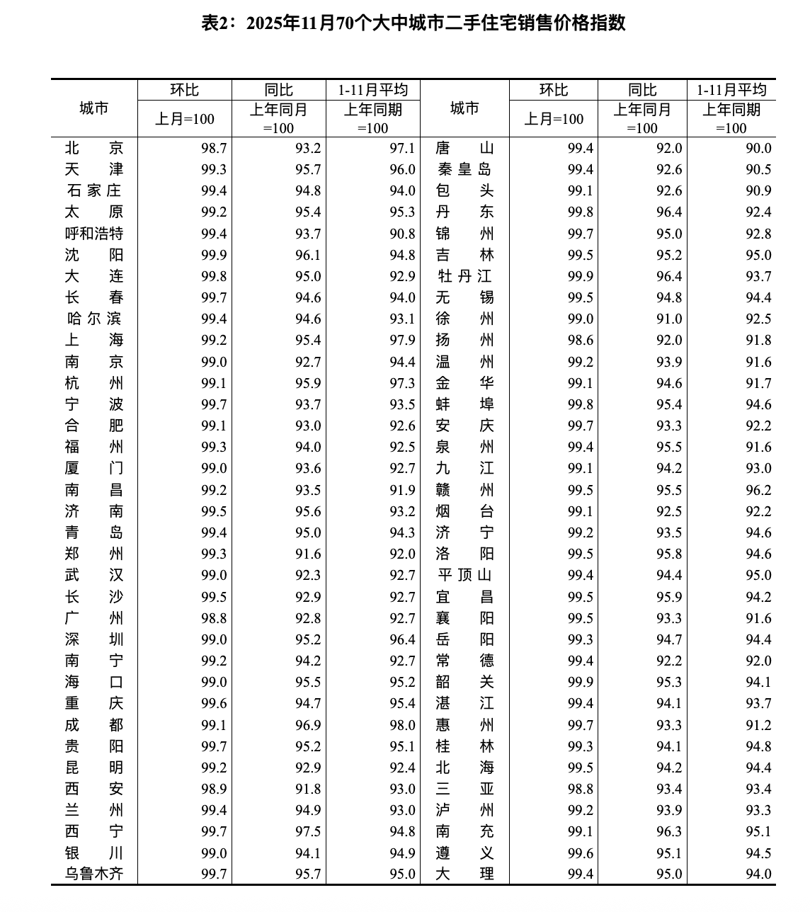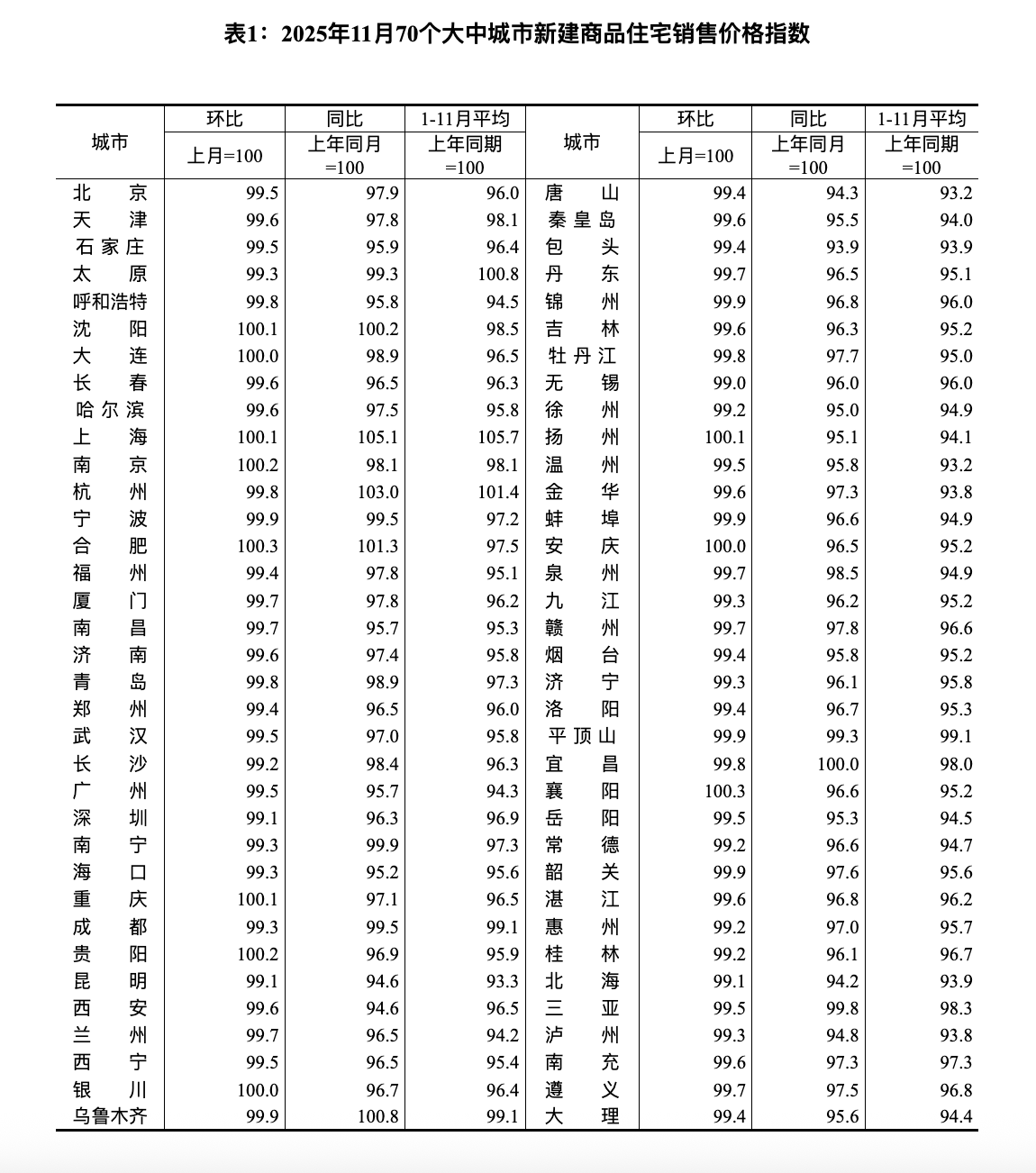 国家统计局城市司首席统计师王中华解读2025年11月份商品住宅销售价格变动情况统计数据称,2025年11月份,70个大中城市商品住宅销售价格环比总体下降、同比降幅扩大。