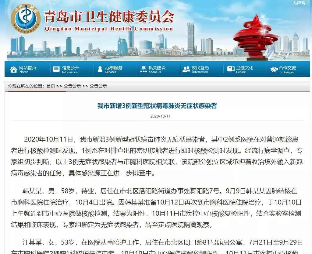2020年10月11日,青岛市新增3例新型冠状病毒肺炎无症状感染者,其中2例系医院在对普通就诊患者进行核酸检测时发现,1例系在对排查出的密切