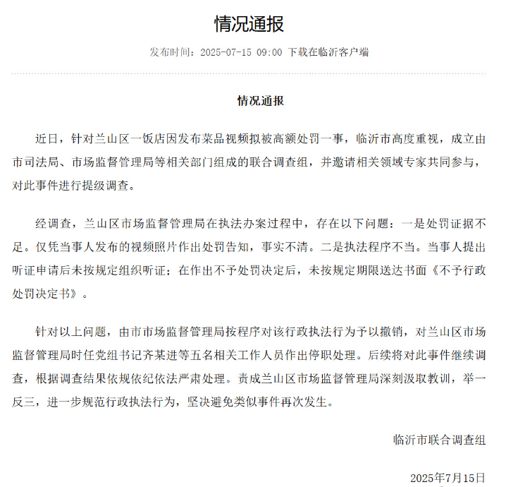 7月15日,临沂市联合调查组就拍摄发布菜品视频被高额处罚事件发布情况通报: