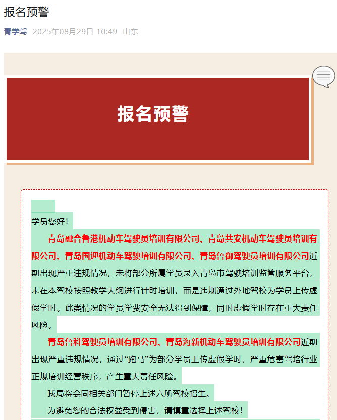 通报称,青岛融合鲁港机动车驾驶员培训有限公司、青岛共安机动车驾驶员培训有限公司、青岛国迎机动车驾驶培训有限公司、青岛鲁御驾驶员培训有限公司近期出现严重违规情况,未将部分所属学员录入青岛市驾驶培训监管服务平台,未在本驾校按照教学大纲进行计时培训,而是违规通过外地驾校为学员上传虚假学时。此类情况的学员学费安全无法得到保障,同时虚假学时存在重大责任风险。