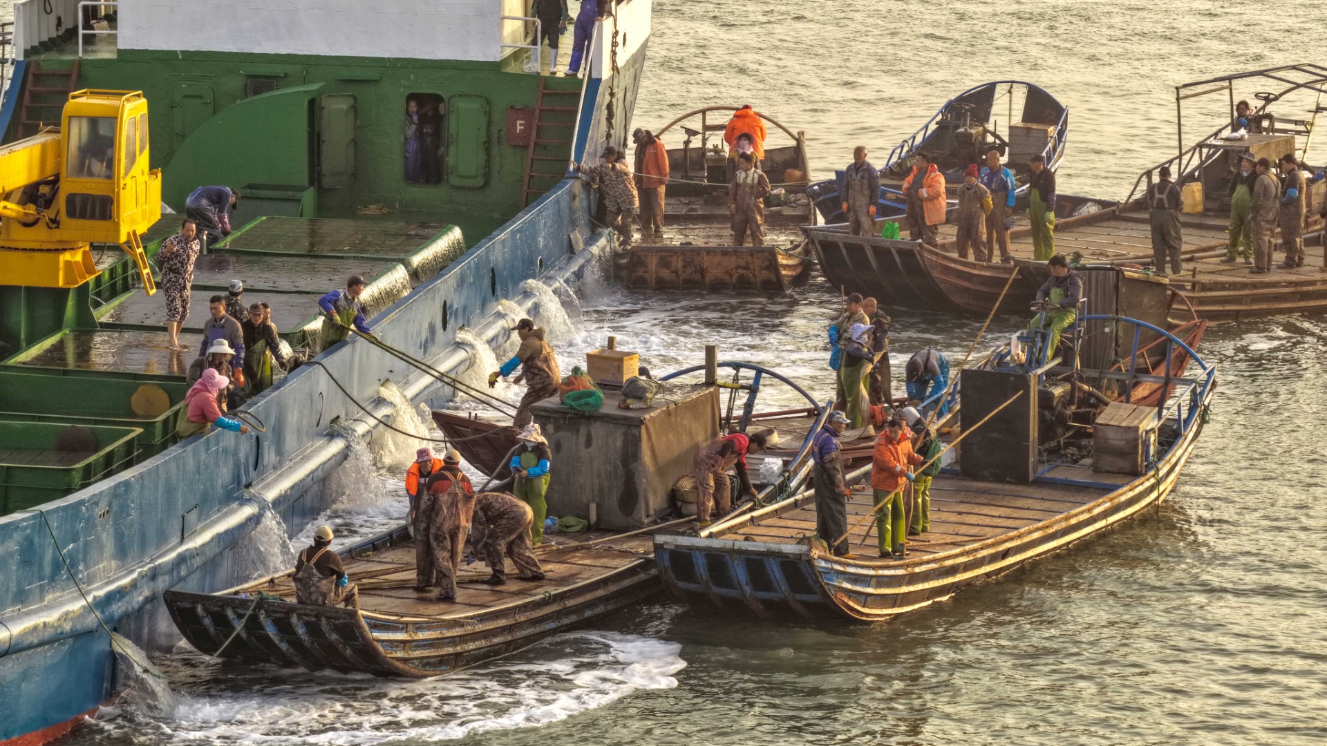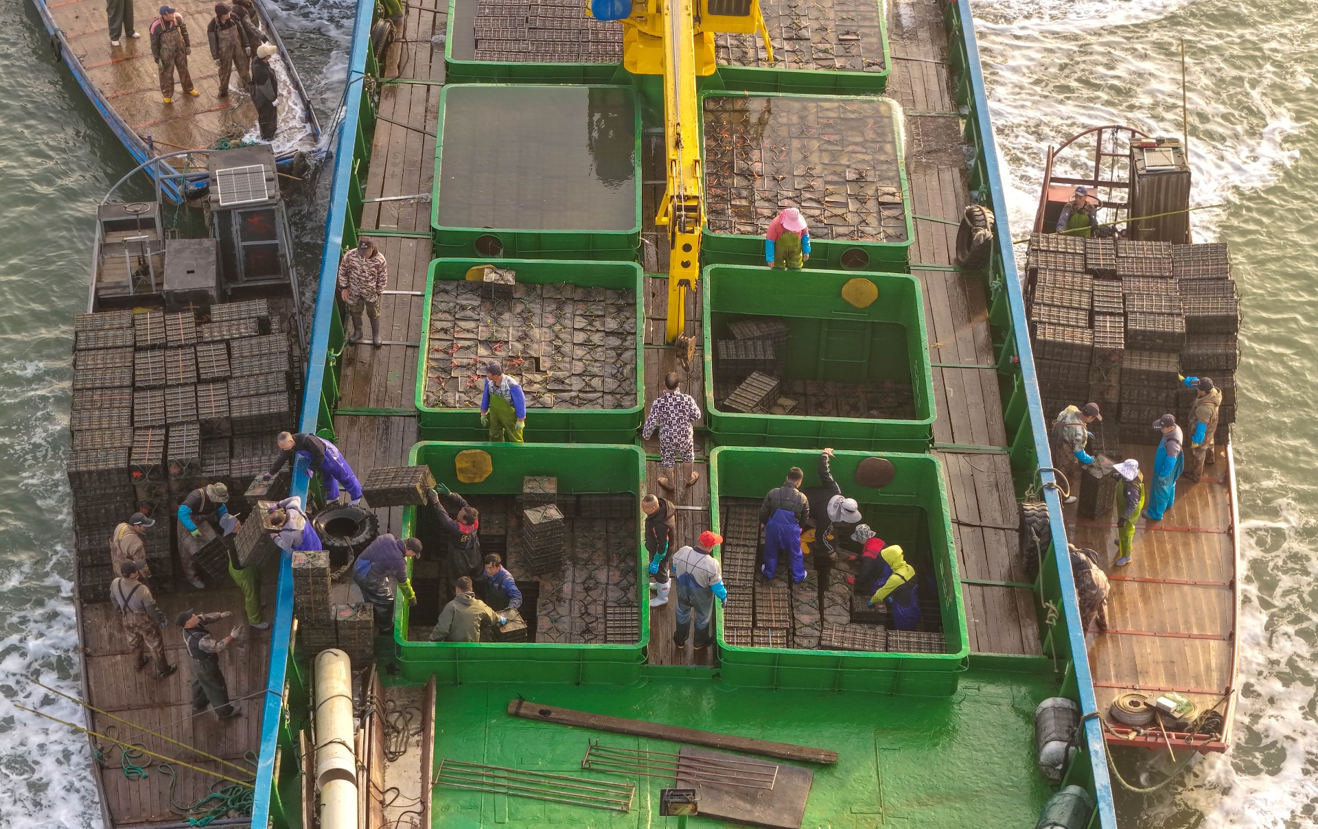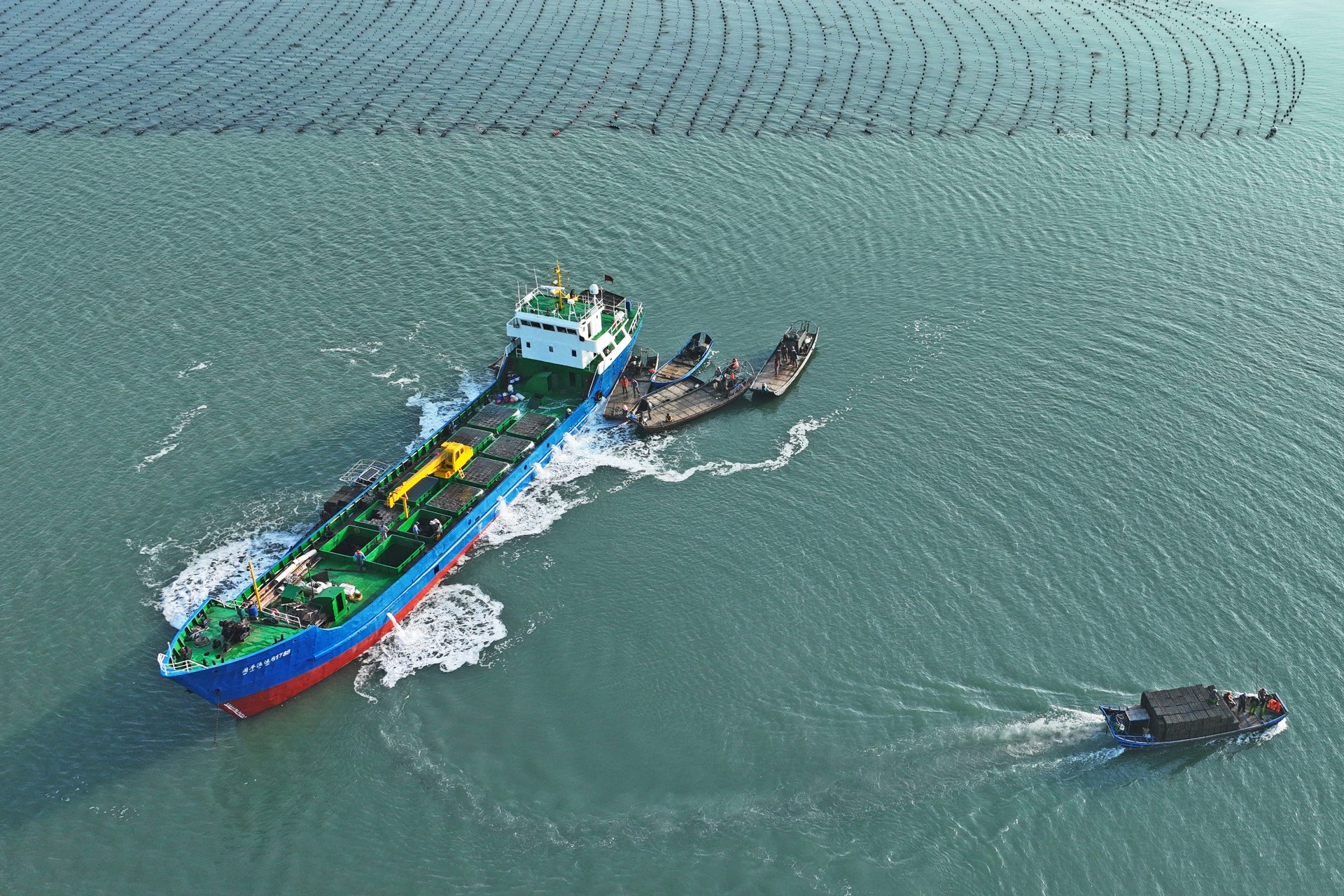 4月18日,在山东省荣成市爱伦湾,养殖工人将从福建海域“越冬”归来的鲍鱼转运到养殖海域(无人机照片)。新华社发(王福东 摄)