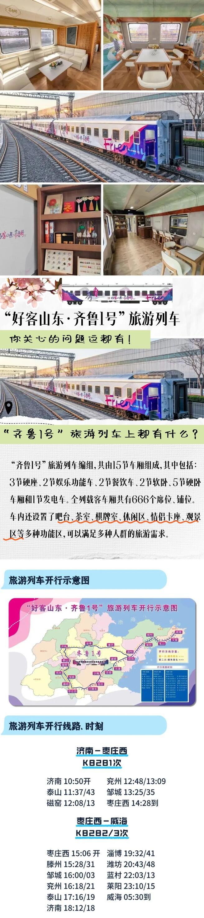 列车共有3条旅游线路,包括济南至枣庄西K8281次、枣庄西至威海K8282/3次和威海至济南K8286/7次,途经全省11个市、22个站点,沿线有200多家景区。乘车旅行可欣赏山东传统文化之美、山水画卷之美、民俗风情之美、生态文明之美、厚德好客之美。