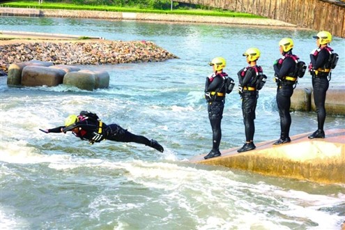 为让学员能真实感受到复杂的水域环境,此次中级技术培训选取日照市水上运动基地和急流回旋训练场地作为主要训练场所。其中,急流回旋场地共设有三条水道,是目前世界上规模最大、标准最高、设施功能最完善的场地。“220米训练水道中主流流速在每秒2米至每秒4米之间,同时存在漩涡流、覆盖流、白色水域等7种危险水流,可让队员充分体验急流的凶猛,掌握脱困技巧。”日照市水域救援教练员团队的负责人张晓明说。