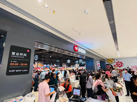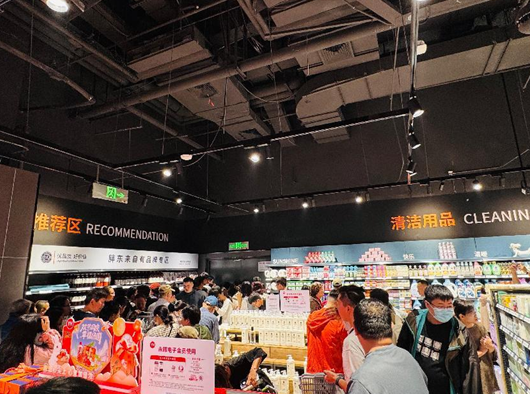 上午9点整,随着卷帘门“哗啦”升起,等候在门外的人群涌入卖场。推车声、欢笑声、问候声瞬间将入口通道填满。“早就听说这是第二家‘胖永辉’,特意从隔壁写字楼过来看看!”在生鲜区挑选三文鱼的周先生向记者展示了他的购物车,里面已放了两盒三文鱼和一瓶DL葡萄汁,“之前在北宸店这个果汁就很抢手,没想到这边货源也很足。”