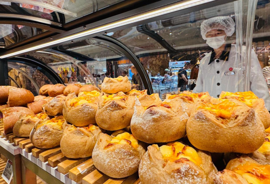 开门不到十分钟,张金文负责的烘焙区前已排起短队。他刚摆上货架的全麦三明治,三分钟内便少了一大半。“快!后面再推一箱来!”托盘碰撞的清脆声中,他侧身穿梭在人群里让徒弟补货,时不时抬手引导顾客使用“永辉生活”APP自助下单,以缓解排队压力。