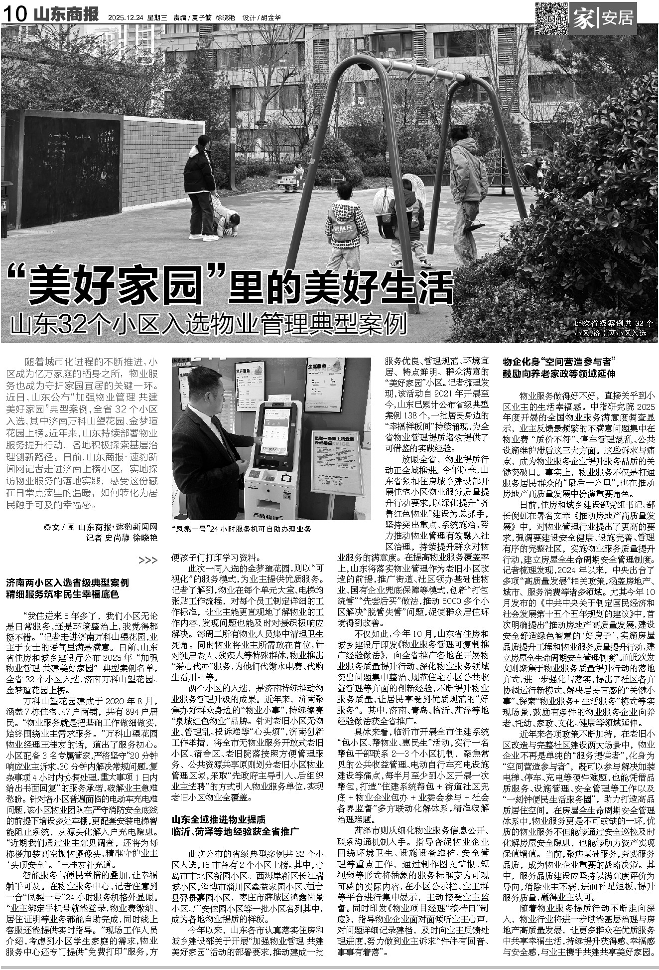 “我住进来5年多了,我们小区无论是日常服务,还是环境整治上,我觉得都挺不错。”记者走进济南万科山望花园,业主于女士的语气里满是满意。日前,山东省住房和城乡建设厅公布2025年“加强物业管理共建美好家园”典型案例名单,全省32个小区入选,济南万科山望花园、金梦瑄花园上榜。