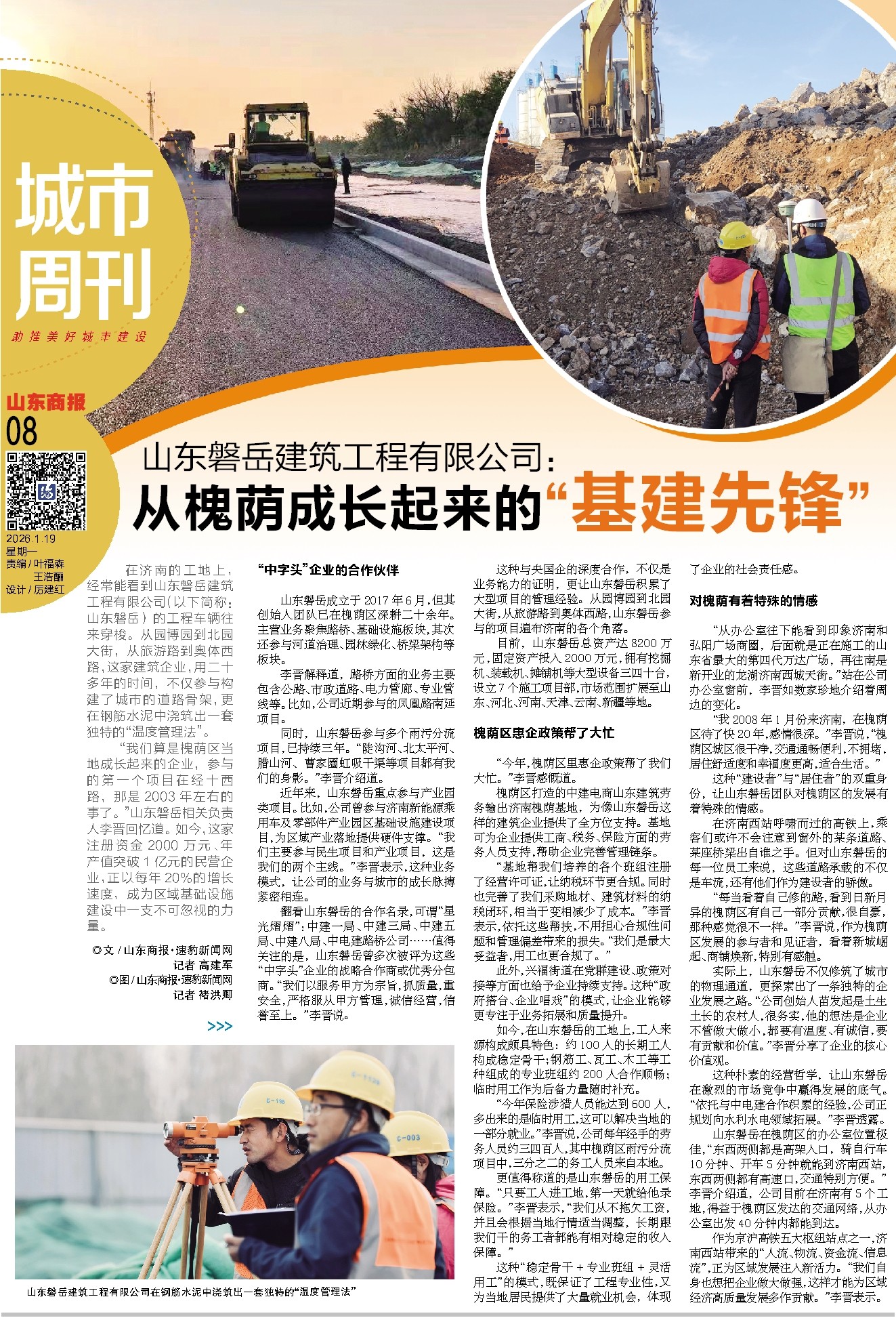 近年来,山东磐岳重点参与产业园类项目。比如,公司曾参与济南新能源乘用车及零部件产业园区基础设施建设项目,为区域产业落地提供硬件支撑。“我们主要参与民生项目和产业项目,这是我们的两个主线。”李晋表示,这种业务模式,让公司的业务与城市的成长脉搏紧密相连。