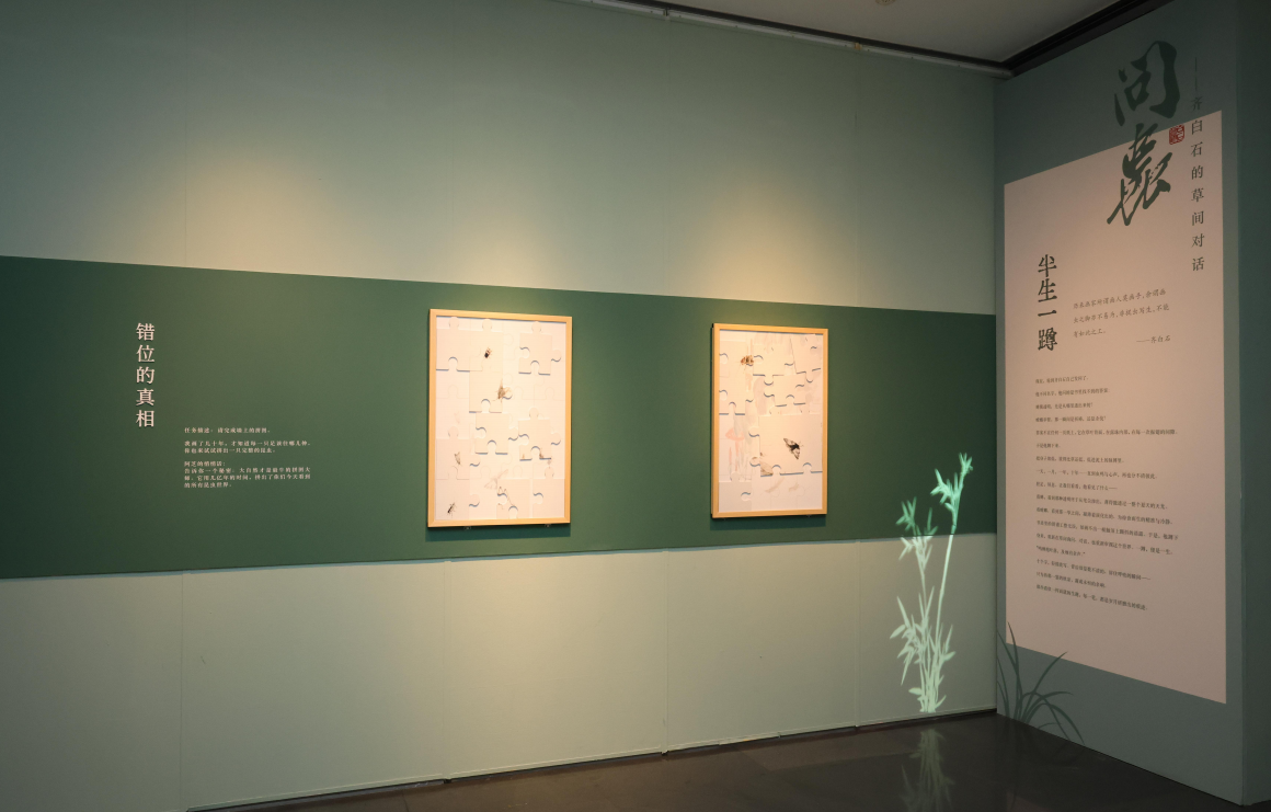 展览的特别之处在于,它源自山东工艺美术学院人文艺术学院《艺术展览与策划》课程,是今年第四届全球大学生虚拟策展大赛(齐白石赛道)特等奖获奖方案的实体转化成果。“问虫”不仅是一场专题展,也是一项具有代表性的教学与策展相结合的案例。它从课堂走向大赛,再走向美术馆,完成了从概念到落地的全过程。本次展览由中央美术学院、山东工艺美术学院、北京画院联合主办,这场由年轻人主导的展览,以“田野考察家”重新定义齐白石,试图把他放回草间,放回那个俯身观察自然的位置。