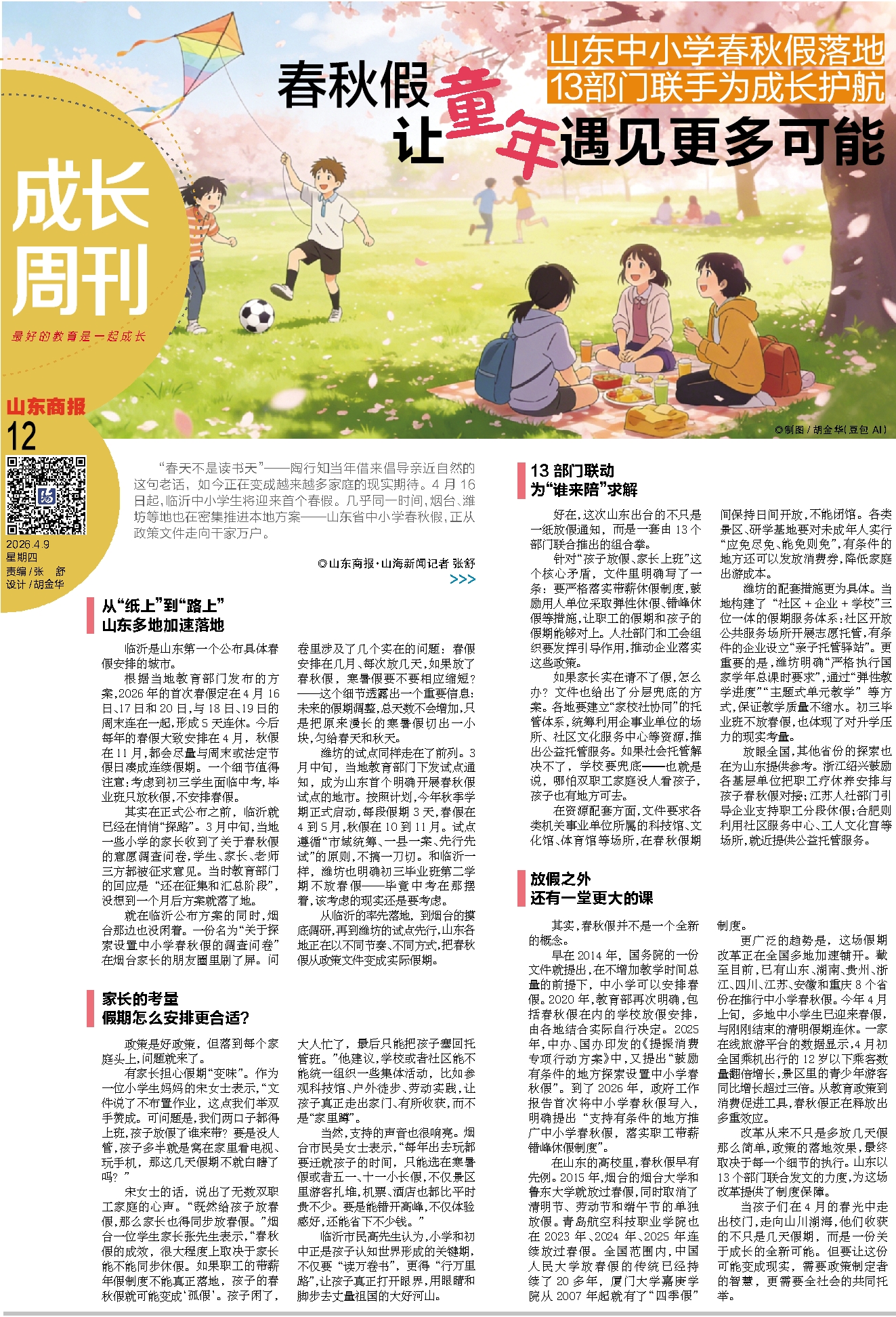 宋女士的话,说出了无数双职工家庭的心声。“既然给孩子放春假,那么家长也得同步放春假。”烟台一位学生家长张先生表示,“春秋假的成效,很大程度上取决于家长能不能同步休假。如果职工的带薪年假制度不能真正落地,孩子的春秋假就可能变成‘孤假’。孩子闲了,大人忙了,最后只能把孩子塞回托管班。”他建议,学校或者社区能不能统一组织一些集体活动,比如参观科技馆、户外徒步、劳动实践,让孩子真正走出家门、有所收获,而不是“家里蹲”。
