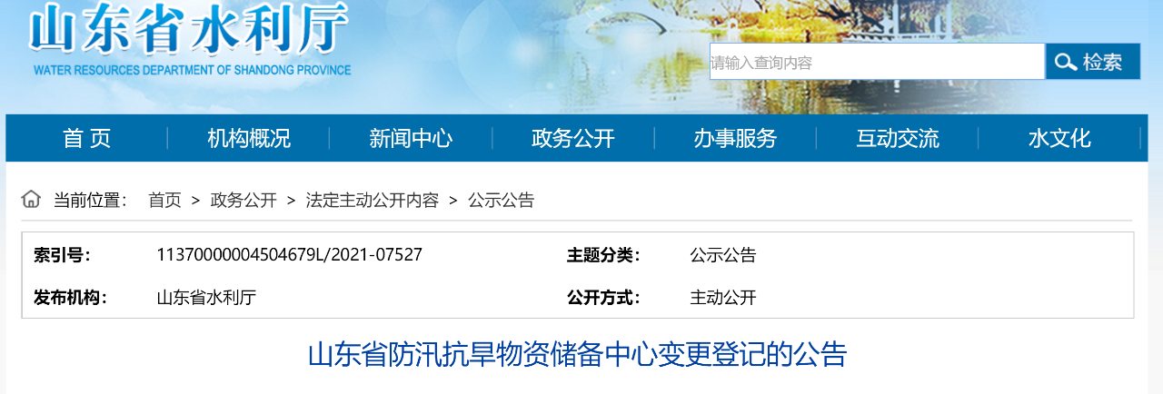2021年6月2日,山东省防汛抗旱物资储备中心经山东省事业单位监督管理局核准,宗旨和业务范围由“承担省级防汛抗旱物资的采购、储备、管理、维护工作;根据防汛抗旱需要调拨物资,并根据使用情况进行回收登记、归库”变更为“承担省级水旱灾害防御物资的采购、储备、管理、使用工作,根据需要调拨物资,并根据使用情况进行回收登记、归库;承担省级水旱灾害防御专业性物资仓库及培训基地的建设、管理工作;承担省级水旱灾害防御队伍建设规划实施、技能培训与演练工作;承担全省水旱灾害防御物资管理与队伍建设的技术指导工作;承担水利风景区建设与管理的技术支撑工作”,特此公告。