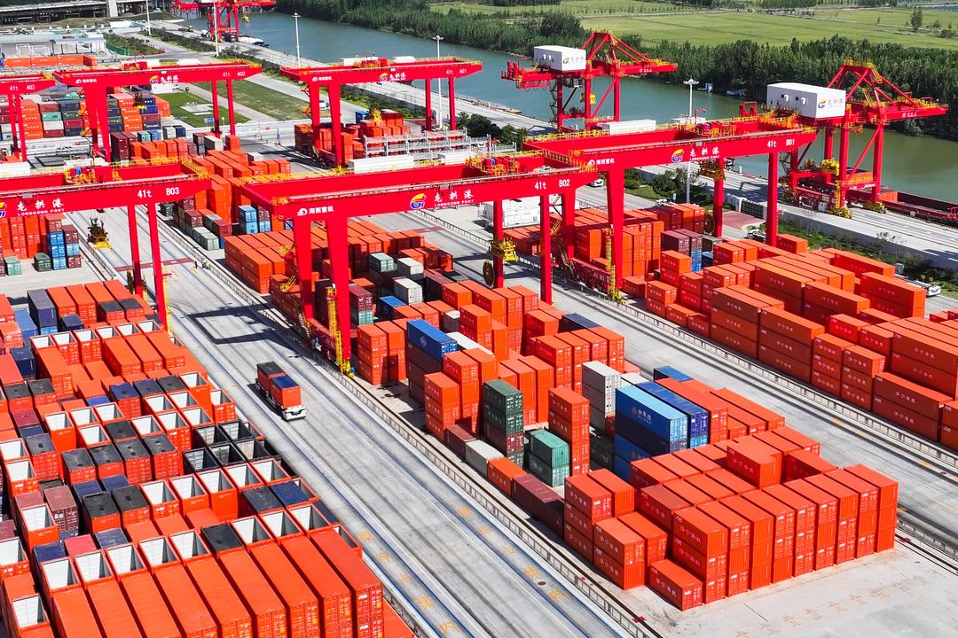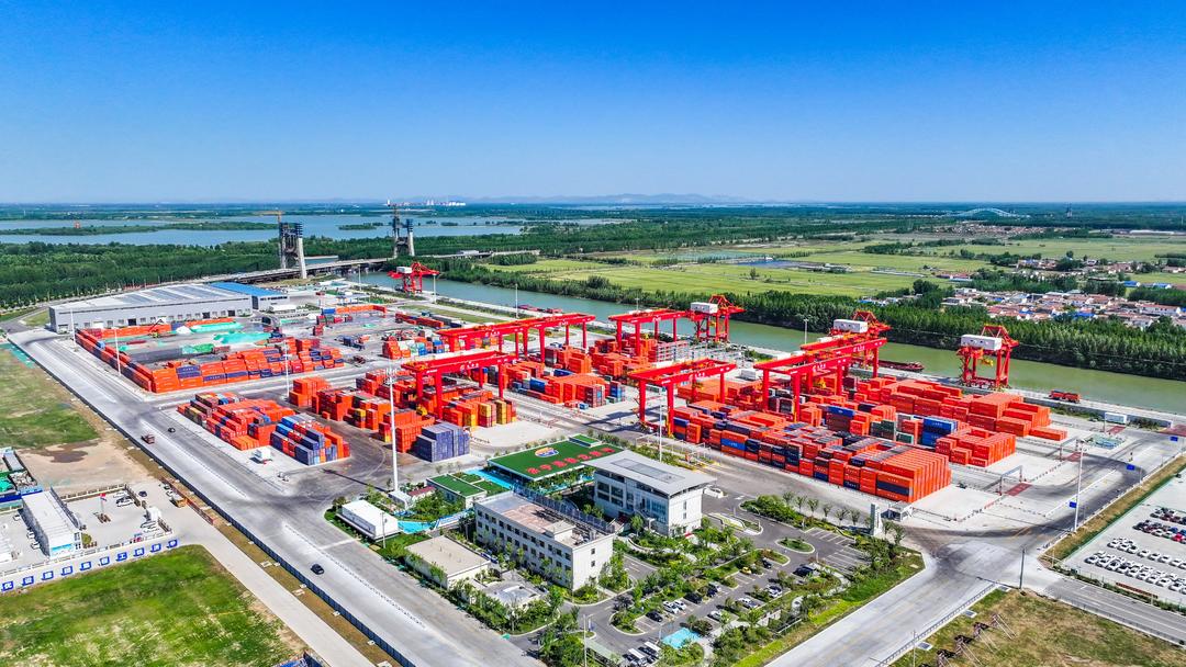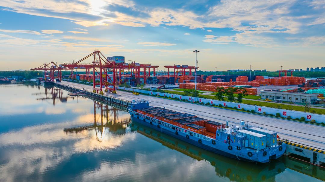 7月15日,记者从济宁市有关部门获悉,2025年上半年,济宁港完成货物吞吐量5575万吨、同比增长10.4%;累计开通集装箱航线29条,完成集装箱吞吐量20.9万标箱、同比增长20.1%,稳居全省内河首位。图为船舶在龙拱港装卸集装箱。