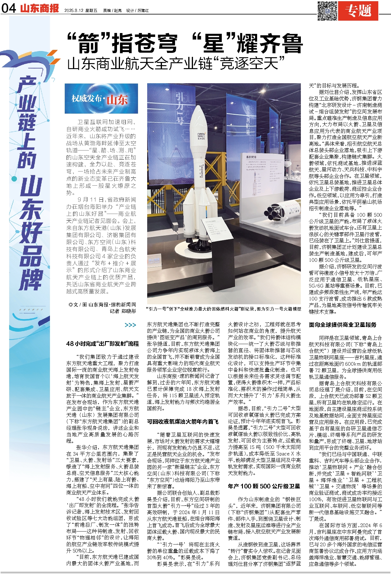 9月11日,省政府新闻办在烟台海阳举办“产业链上的山东好品”——商业航天产业链记者见面会。会上,来自东方航天港(山东)发展集团有限公司、济钢集团有限公司、东方空间(山东)科技有限公司、青岛上合航天科技有限公司4家企业的负责人通过“发布+推介+展示”的形式介绍了山东商业航天产业链上的优质产品,共话山东省商业航天产业跨越式高质量发展。
