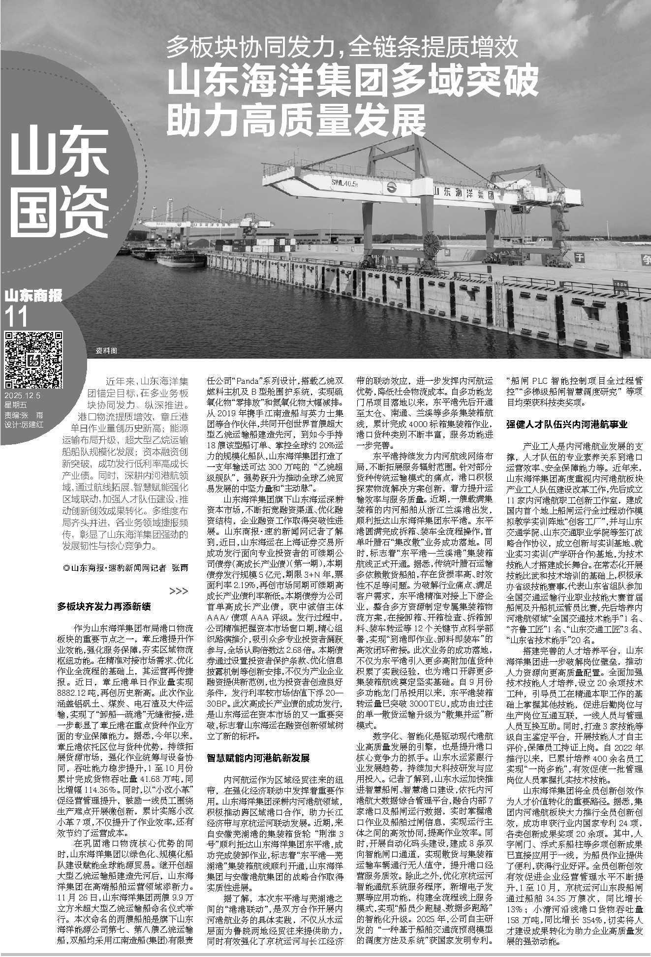 近年来,山东海洋集团锚定目标,在多业务板块协同发力、纵深推进。港口物流提质增效,章丘港单日作业量创历史新高;能源运输布局升级,超大型乙烷运输船船队规模化发展;资本融资创新突破,成功发行低利率高成长产业债。同时,深耕内河港航领域,通过航线拓展、智慧赋能强化区域联动,加强人才队伍建设,推动创新创效成果转化。多维度布局齐头并进,各业务领域捷报频传,彰显了山东海洋集团强劲的发展韧性与核心竞争力。