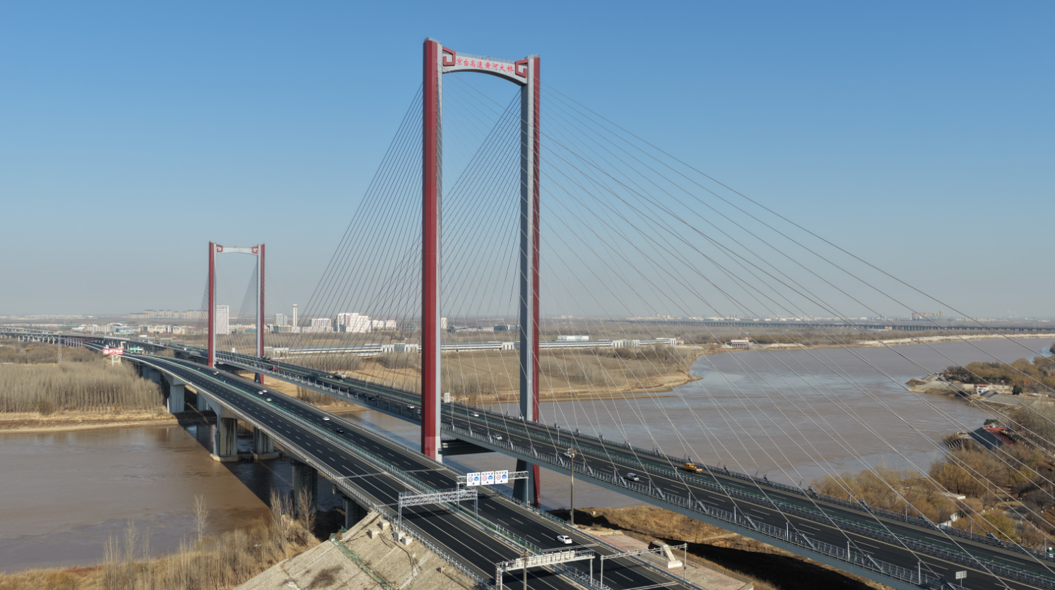 项目在老桥下游并桥新建黄河特大桥一座,新建桥梁为主跨530米的高低塔双索面斜拉桥,创新采用国内首个钢壳—混凝土混合桥塔结构,成为我国高速公路改扩建黄河大桥并桥建设的标杆工程。