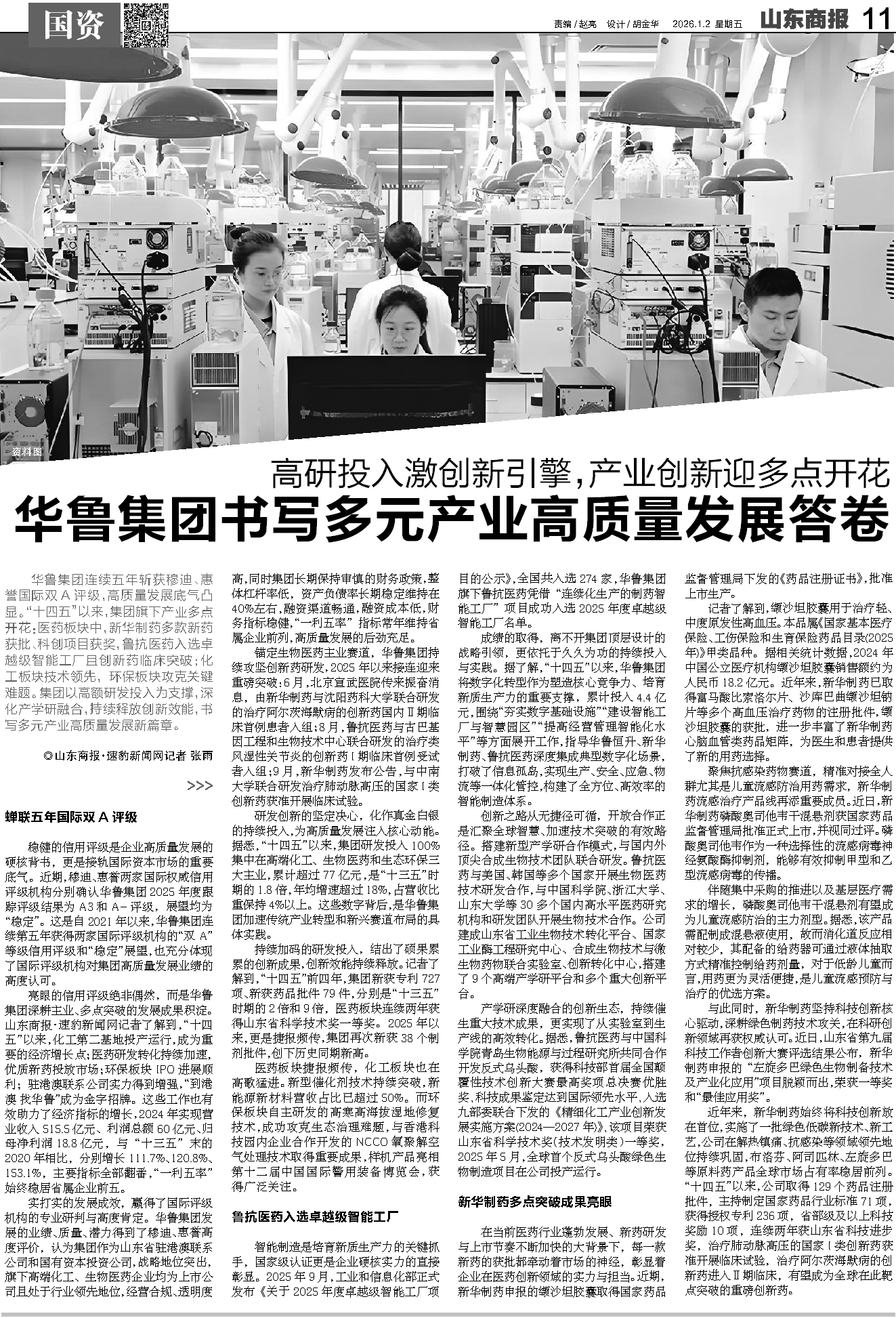 华鲁集团连续五年斩获穆迪、惠誉国际双A评级,高质量发展底气凸显。“十四五”以来,集团旗下产业多点开花:医药板块中,新华制药多款新药获批、科创项目获奖,鲁抗医药入选卓越级智能工厂且创新药临床突破;化工板块技术领先,环保板块攻克关键难题。集团以高额研发投入为支撑,深化产学研融合,持续释放创新效能,书写多元产业高质量发展新篇章。