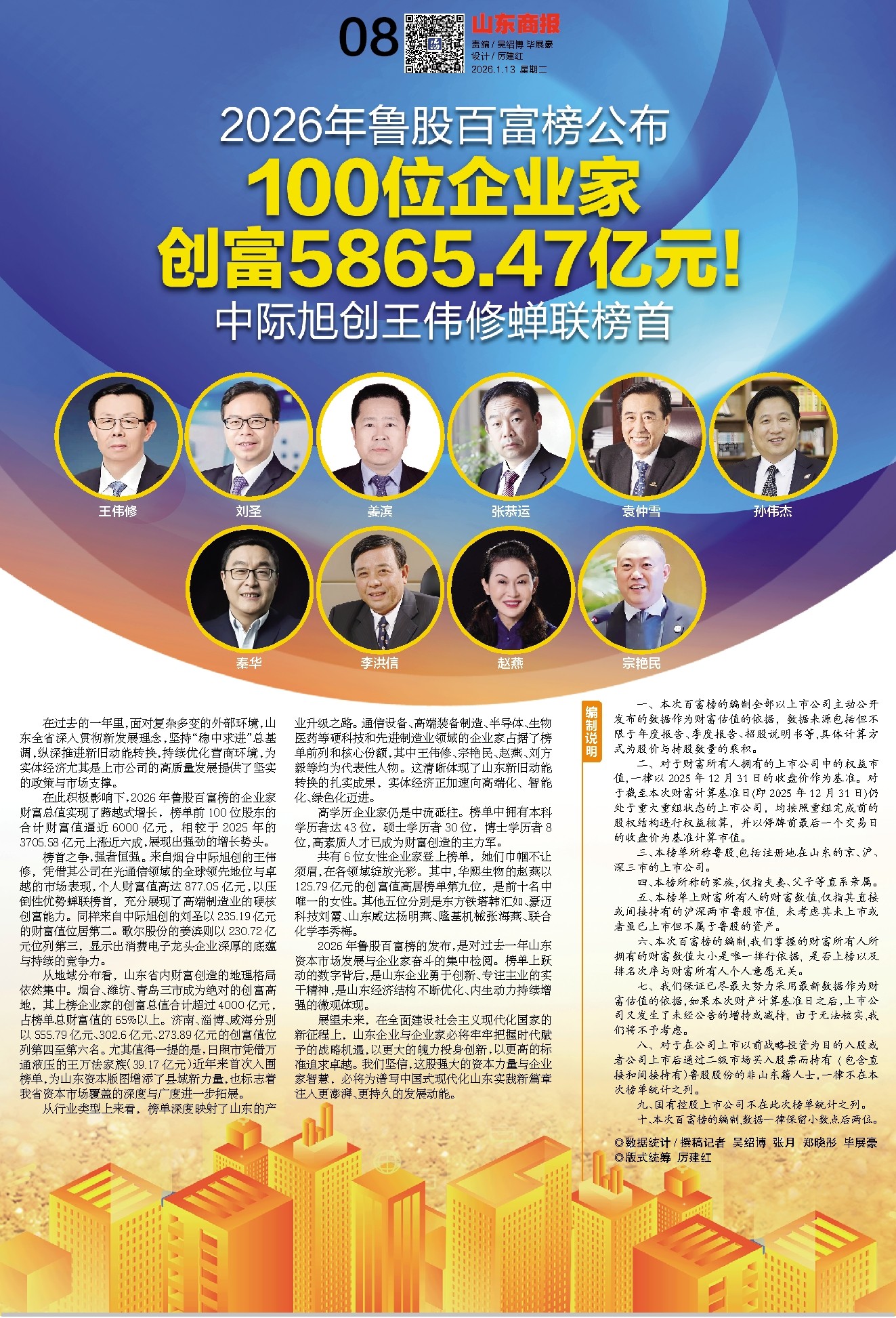 五、本榜单上财富所有人的财富数值,仅指其直接或间接持有的沪深两市鲁股市值,未考虑其未上市或者虽已上市但不属于鲁股的资产。