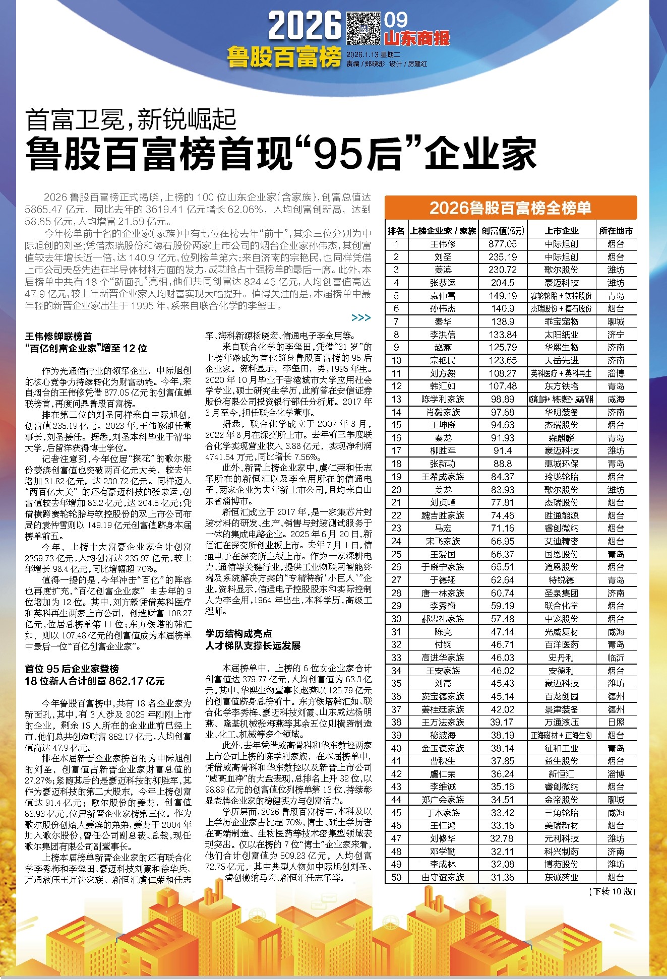 2026鲁股百富榜正式揭晓,上榜的100位山东企业家(含家族),创富总值达5865.47亿元,同比去年的3619.41亿元增长62.06%,人均创富创新高,达到58.65亿元,人均增富21.59亿元。