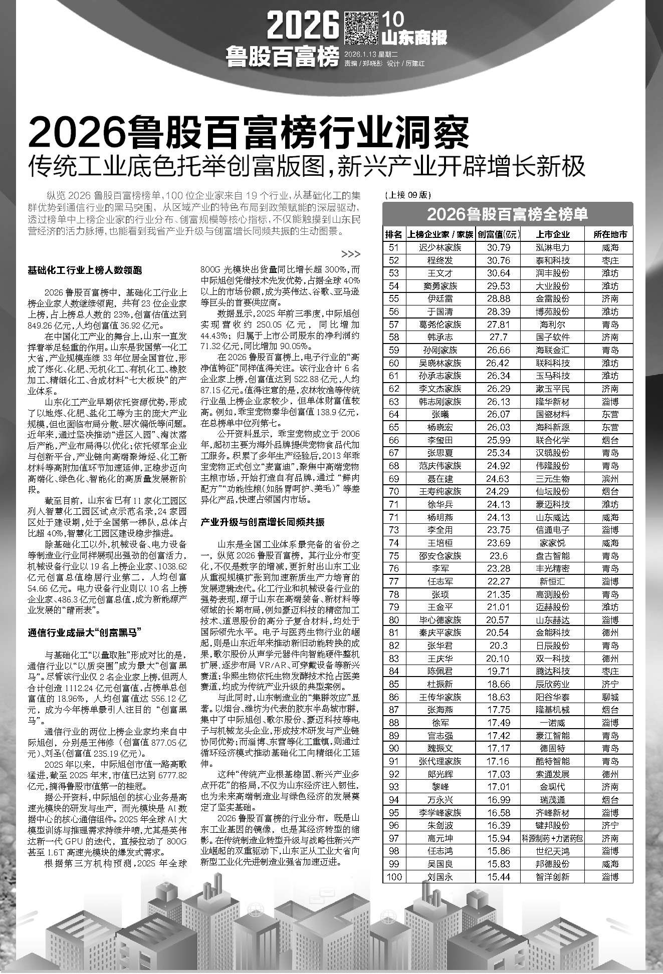 纵览2026鲁股百富榜榜单,100位企业家来自19个行业,从基础化工的集群优势到通信行业的黑马突围,从区域产业的特色布局到政策赋能的深层驱动,透过榜单中上榜企业家的行业分布、创富规模等核心指标,不仅能触摸到山东民营经济的活力脉搏,也能看到我省产业升级与创富增长同频共振的生动图景。