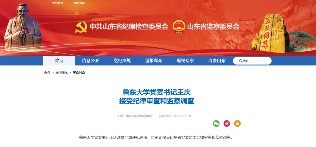 据山东省纪委监委网站1月19日消息:鲁东大学党委书记王庆涉嫌严重违纪违法,目前正接受山东省纪委监委纪律审查和监察调查。