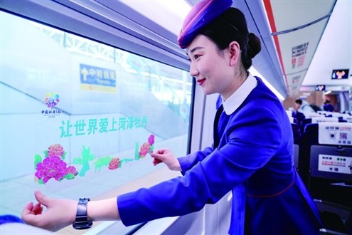 除此之外,在列车首发日,也将以“乘高铁·赏国色·游菏泽”为主题,深度融合菏泽牡丹文化与非遗特色,打造沉浸式文旅出行体验。“我们在列车车厢张贴精美牡丹窗花,摆放雅致牡丹插花,且将餐吧升级为‘牡丹主题餐吧’,供应牡丹鲜花饼、牡丹茶等特色美食。”据中国铁路济南局相关负责人介绍,届时,在车内还将设置文化互动环节,由专人讲解菏泽牡丹历史、品种及节会亮点,邀请民间艺人现场展示牡丹剪纸、面塑等非遗技艺,并为旅客赠送牡丹油、牡丹护手霜、牡丹牙膏等精美礼品。